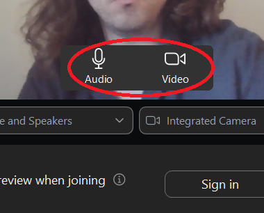 - Zoom will load a preview screen where you can turn on your audio and video (circled in red),